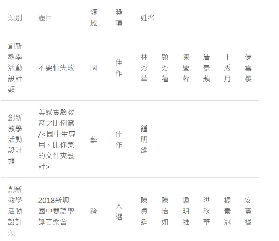 本校林秀華等12名教師(如附)參加臺北市第20屆中小學及幼兒園教育專業創新及行動研究獲得佳作及入選,全體師生同賀!